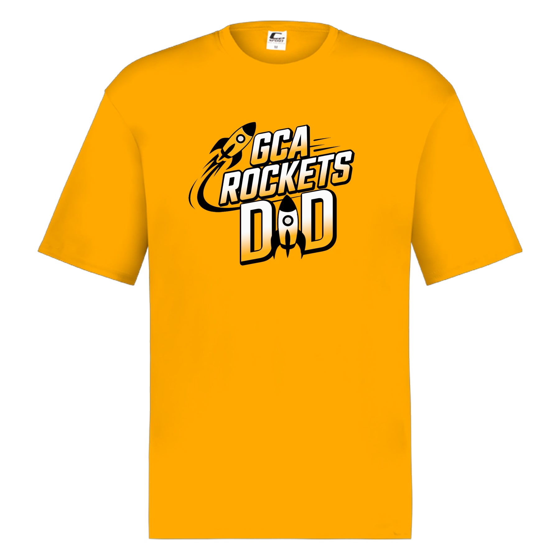 Each shirt features a dynamic rocket-inspired graphic with the words “GCA Rockets Dad” front and center. The bold black-and-white design pops against both color options, making it the perfect choice for game days, school events, or everyday wear.