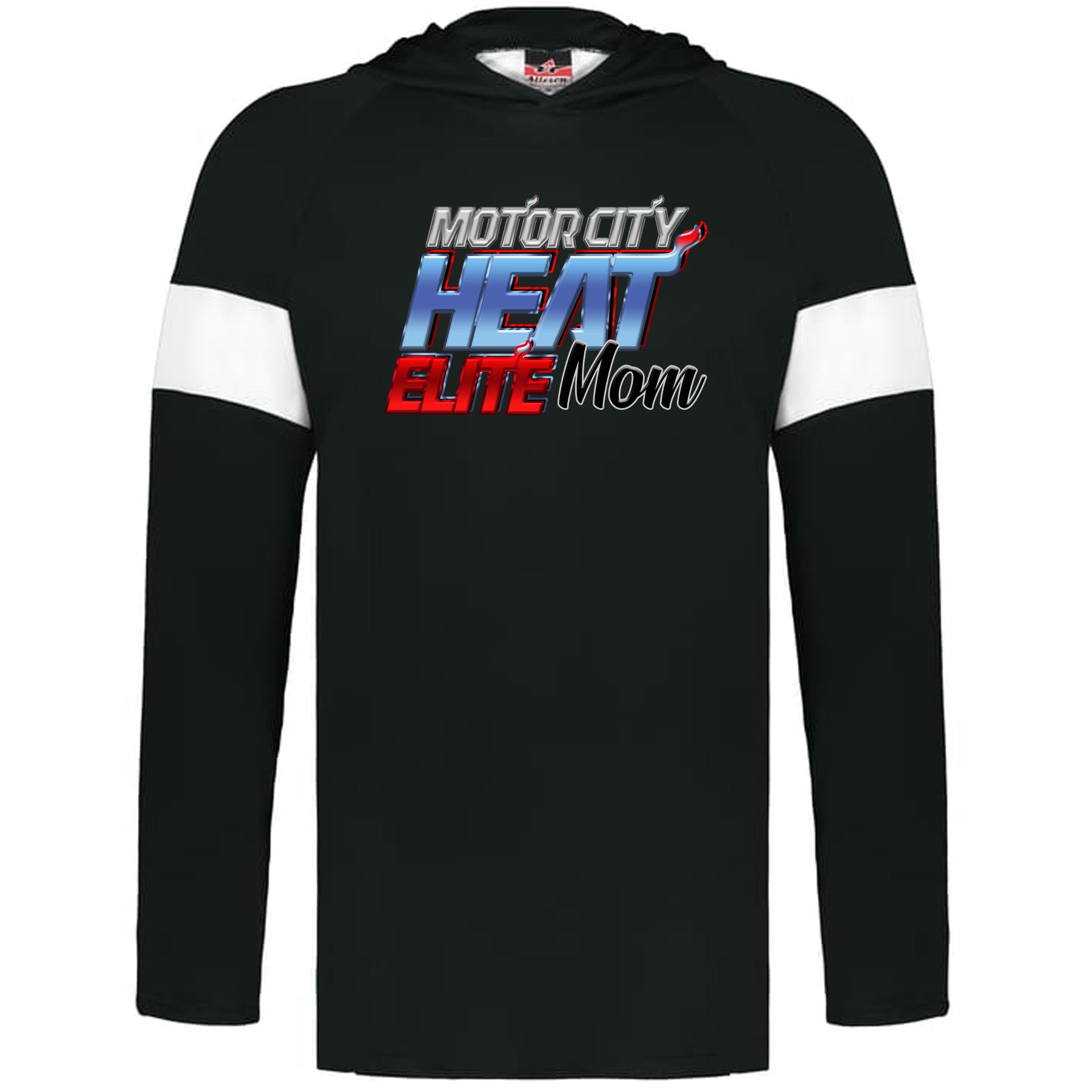 Front Detail: Features the striking Motor City Heat Elite Mom logo across the chest in a bold red, white, and blue gradient print.