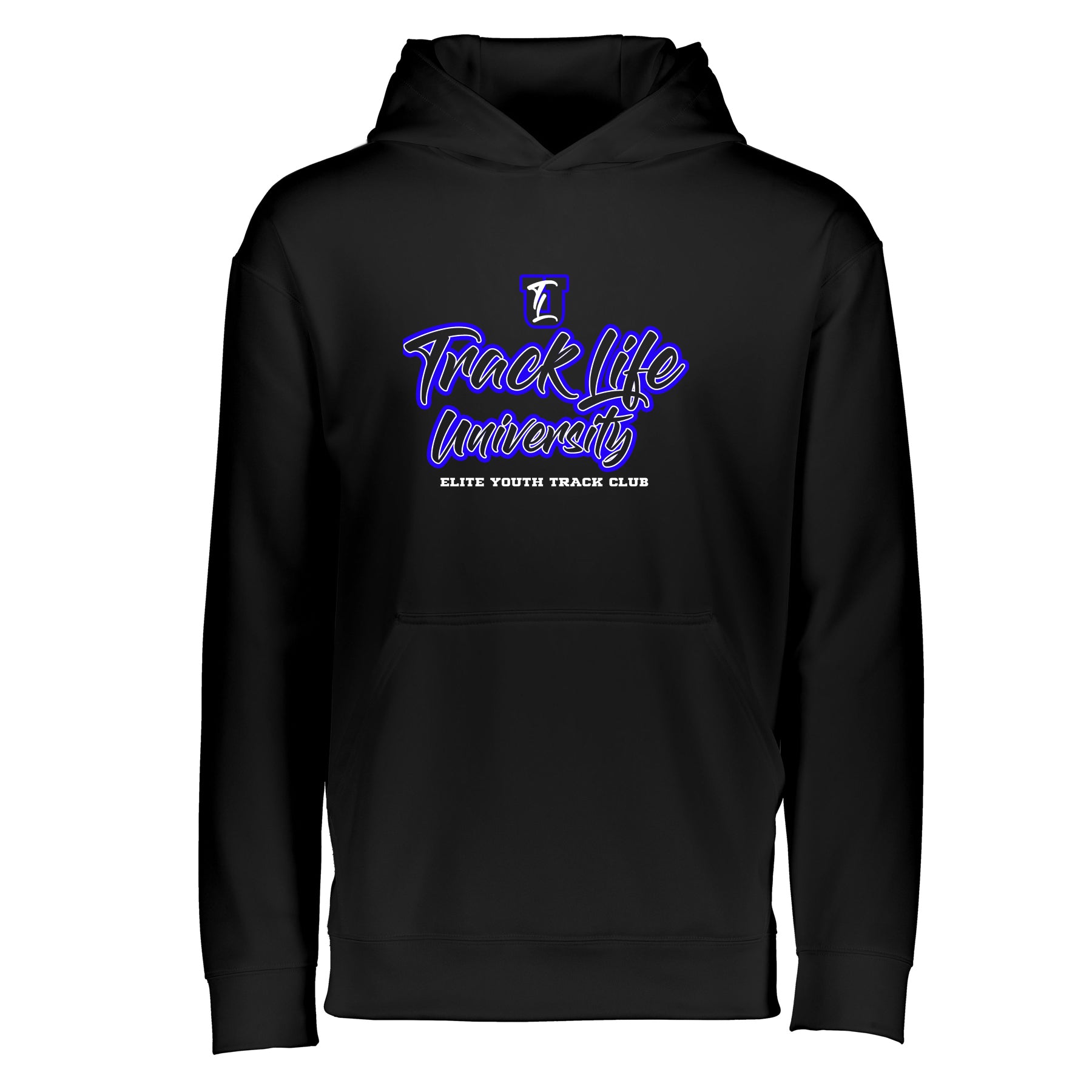 The TLU Elite Track Club Wicking Fleece Hoodie is a cozy yet performance-oriented addition to any athlete's wardrobe. This hoodie is made of 5.9 ounce 100% polyester performance wicking fleece, which wicks moisture away from the body.